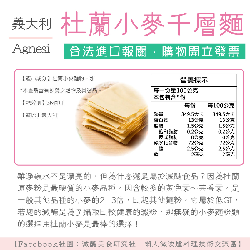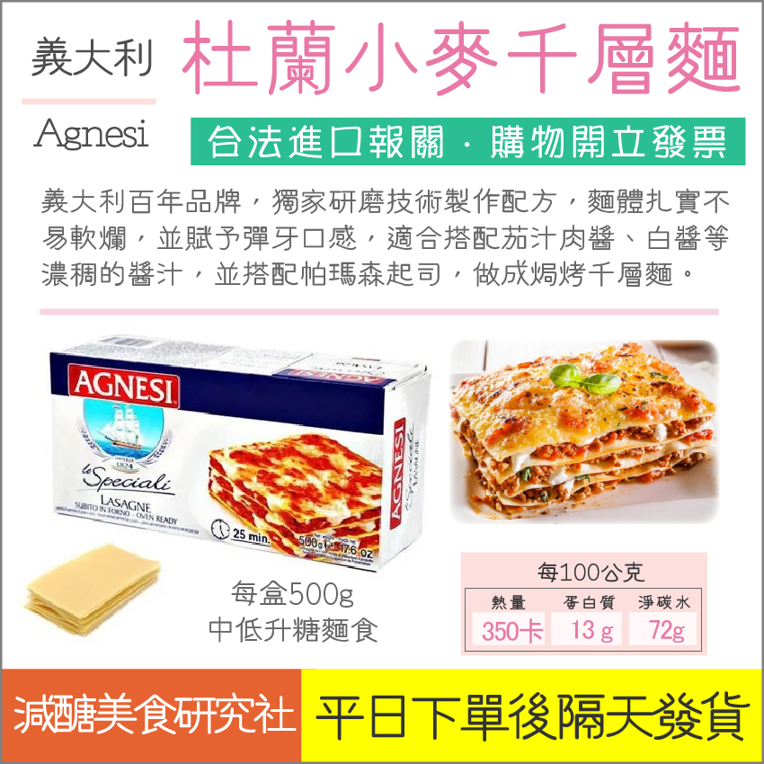 義大利百年品牌,獨家研磨技術製作配方,麵體扎實不易軟爛,並賦予彈牙口感,適合搭配茄汁肉醬、白醬等濃稠的醬汁,並搭配帕瑪森起司,做成焗烤千層麵。